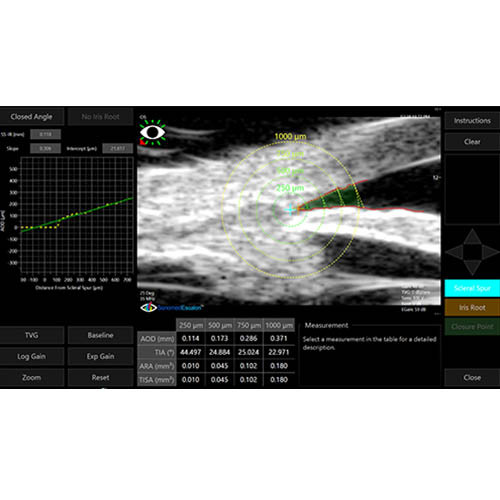 • Análisis cuantitativo del ángulo: métricas precisas del ángulo iridocorneal en distintas condiciones de pupila (midriasis/miosis), con seguimiento en el tiempo.